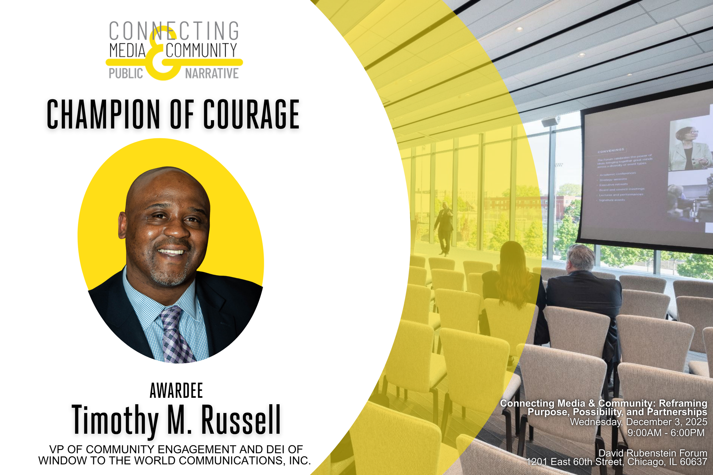 Public Narrative is honored to recognize Timothy M. Russell, Vice President of Community Engagement and Diversity, Equity & Inclusion at WTTW/WFMT, as a 2025 Champion of Courage! Tim's leadership in shaping community engagement strategies exemplifies the vital connection between content creators and diverse audiences. His work ensures that Chicago's PBS station truly reflects and serves all communities. With an impressive background spanning philanthropy, corporate diversity initiatives, and non-profit leadership, Tim brings a wealth of experience to his role. His commitment to inclusivity and social impact has earned him numerous accolades, including recognition from Savoy Magazine and Diversity MBA Magazine. Join us on December 3rd to celebrate Tim's outstanding contributions and explore innovative approaches to media engagement that bridge cultural divides and strengthen our community fabric.