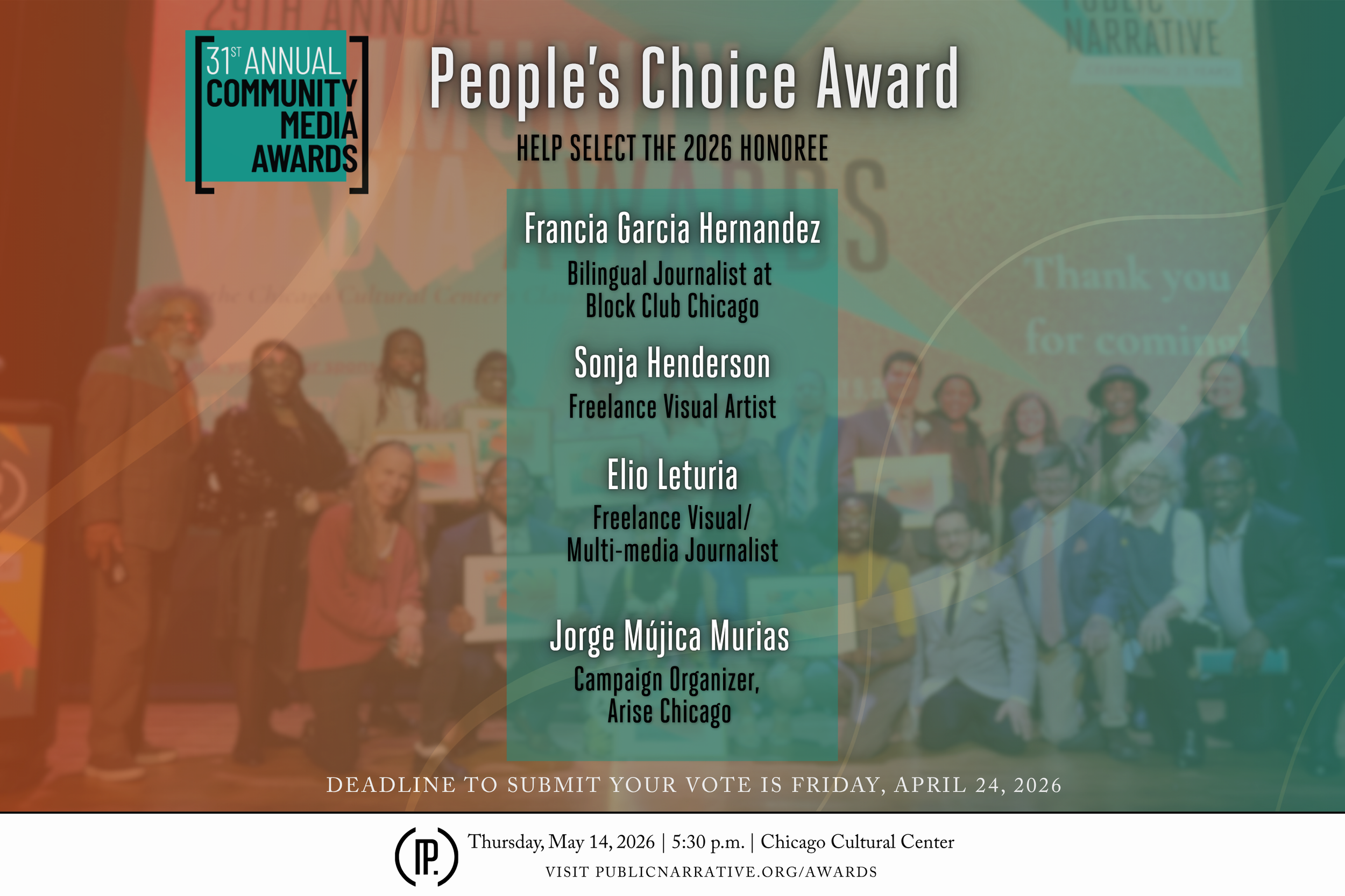 We will celebrate their achievements at the 31st Annual Community Media Awards on Thursday, May 14, 2026, at 5:30 p.m. in the Claudia Cassidy Theater at the Chicago Cultural Center. This inspiring celebration will honor exceptional journalists, storytellers, and media makers whose work informs, uplifts, and drives meaningful change.