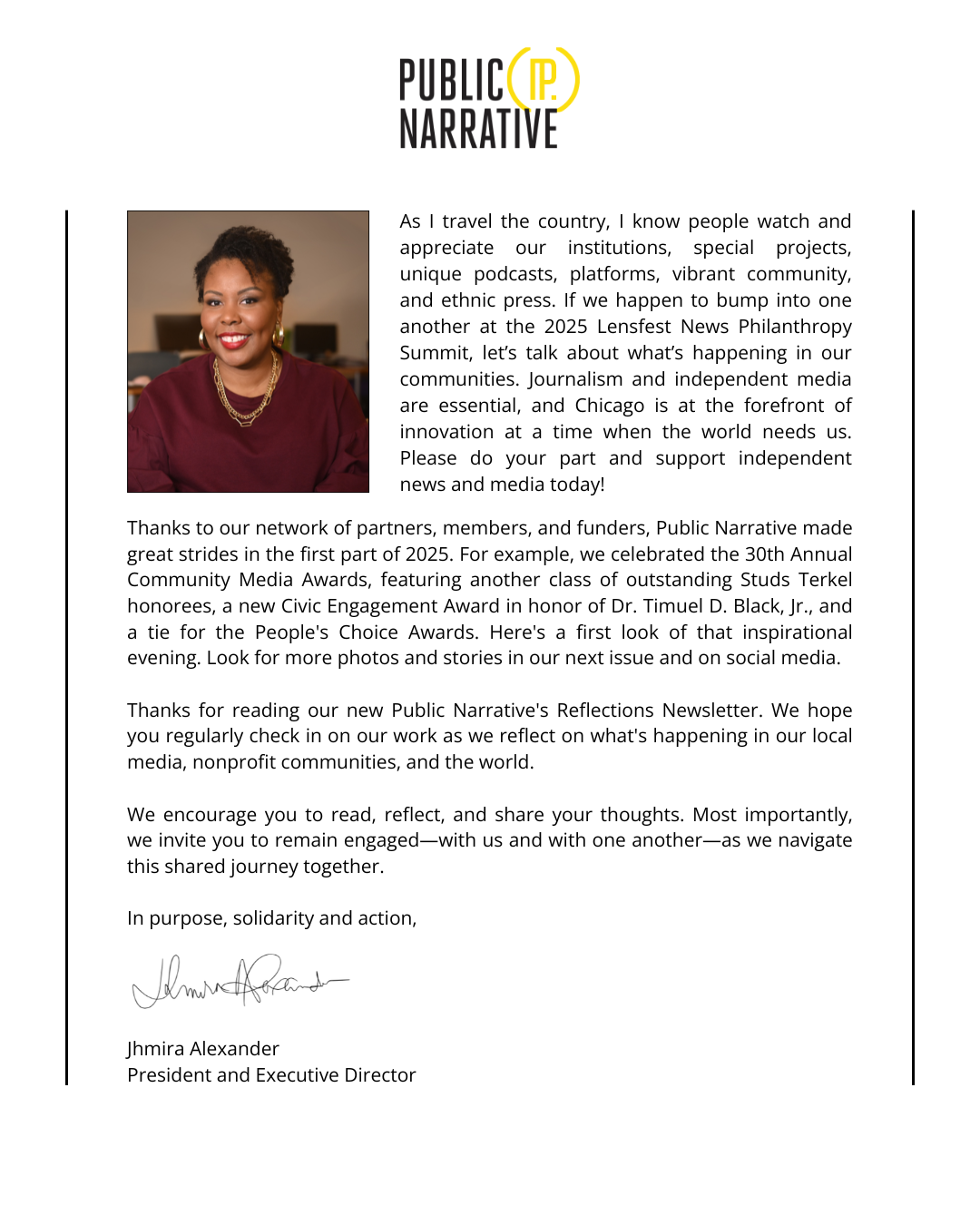 Welcome to Reflections, the new official newsletter for all things related to Public Narrative! We will guide you through news you may have missed, share local jobs and resources, spotlight events, and prospects of interest of nonprofit organizations, storytellers, newsrooms, mediamakers, and policy makers. Plus, there is a section for and for Chicago Independent Media Alliance (CIMA) members, and a message from our President and Executive Director, Jhmira Alexander. Let us know what you think!