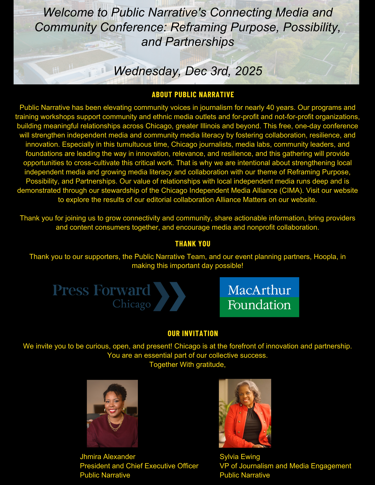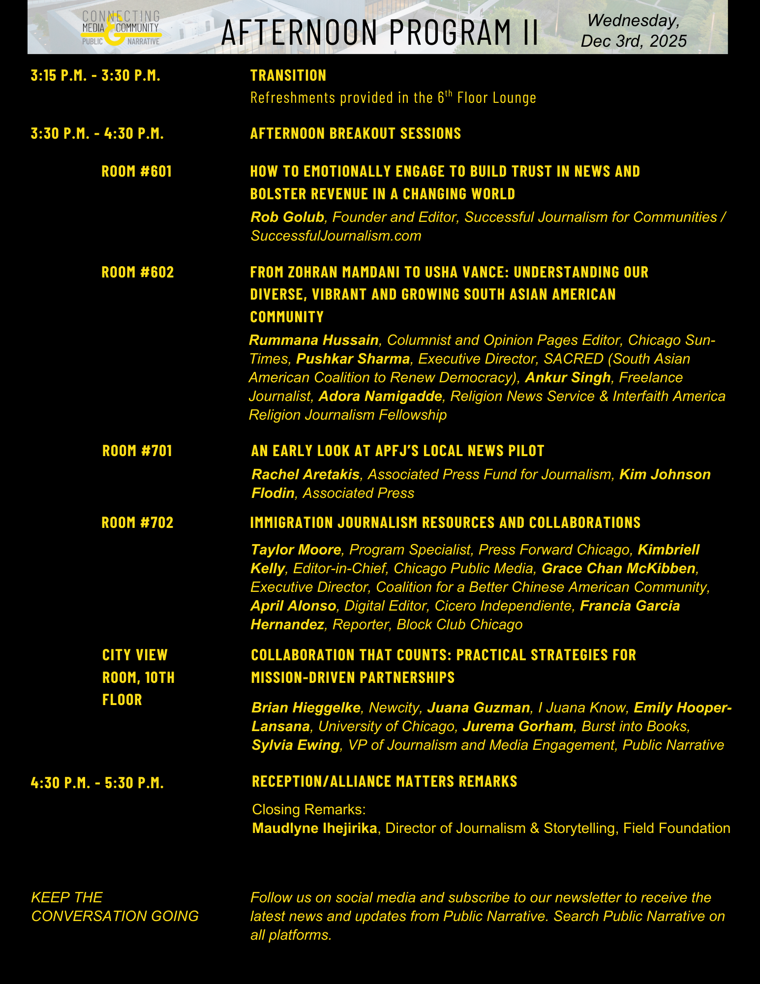 Participants will leave with a deeper understanding of how to tap into local insights, use data to elevate authentic narratives, and build sustainable partnerships across sectors. This session is ideal for those seeking to bridge the gap between media and community, and to reframe how we listen, respond, and collaborate in service of a more informed and empowered Chicago.